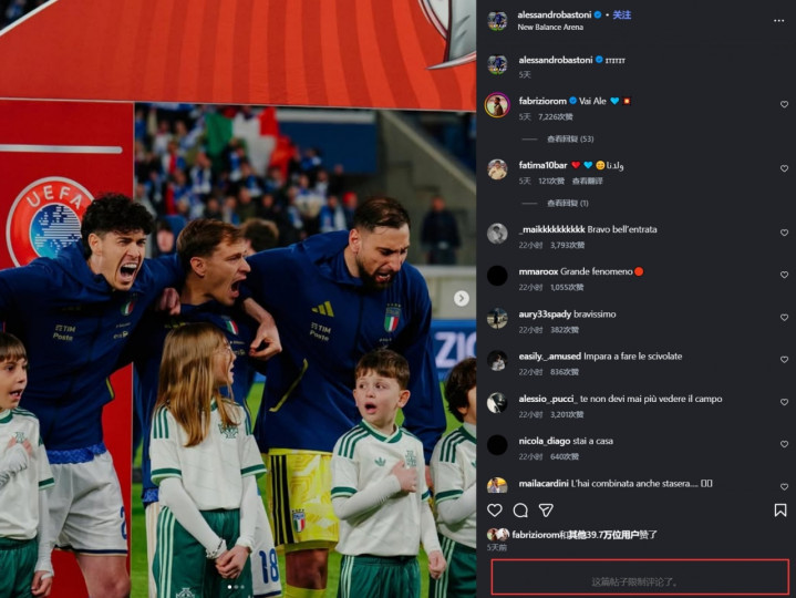 直播吧04月02日讯世欧预附加赛决赛,意大利不敌波黑,无缘晋级2026好意思加墨寰球杯。巴斯托尼本场染红,赛后他成为被挑剔的一大见地。赛后巴斯托尼莫得更新社媒,他社媒最新一条照旧附加赛半决赛晋级的践诺。