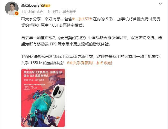 同期, @李杰Louis 还露出,“跟寰球共享一个好讯息,包含#一加15T# 在内的 5 款一加手机将首批搭救《丧胆条约手游》原生 165Hz 高帧率形状。