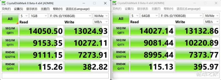 在CrystalDiskMark测试中,1GB和64GB的测试二者的进展险些完全一致。顺序读取速率打破了14GB/s,达到了14050MB/s,写入速率也有13024MB/s;4K立地读取115MB/s,4K立地写入382MB/s。