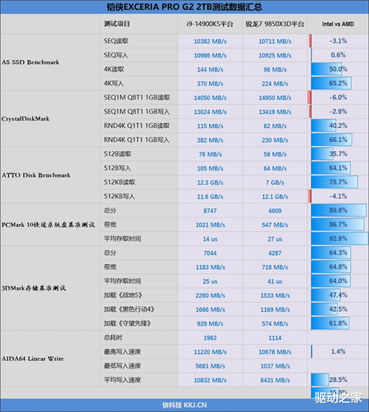AMD平台在顺序读写方面要略强一些,但在其他测试尺度,i9-14900KS齐获取了当先,平均下来有45%的上风。