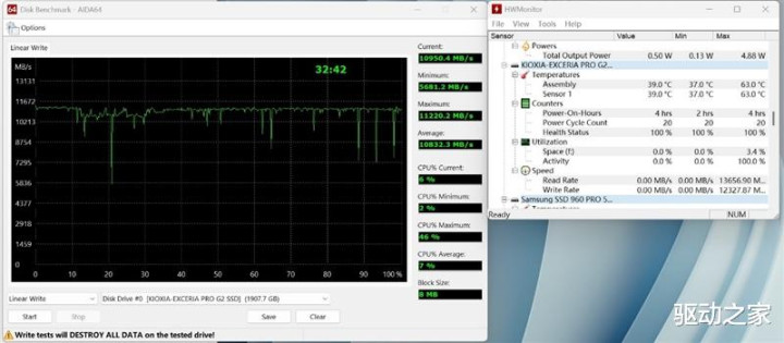 统统测试经过中,仅有偶尔几秒钟会掉到6000MB/s操纵,其他时分写入速率齐在10000MB/s以上。