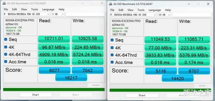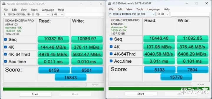 左边是1GB容量的测试,AS SSD Benchmark总分为15843,最高顺序读取、写入速率分裂为10382MB/s、10986MB/s,4K立地读写速率为144MB/s、370MB/s。