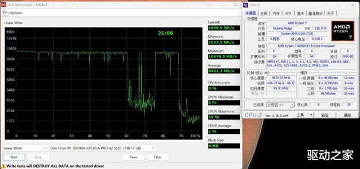 AMD平台进展稍差一些,在前60%齐不错踏实在10000MB/s以上,尔后会干预GC垃圾回收阶段,写入速率来往当先但最低也有1037MB/s,平均写入速率是8431MB/s。