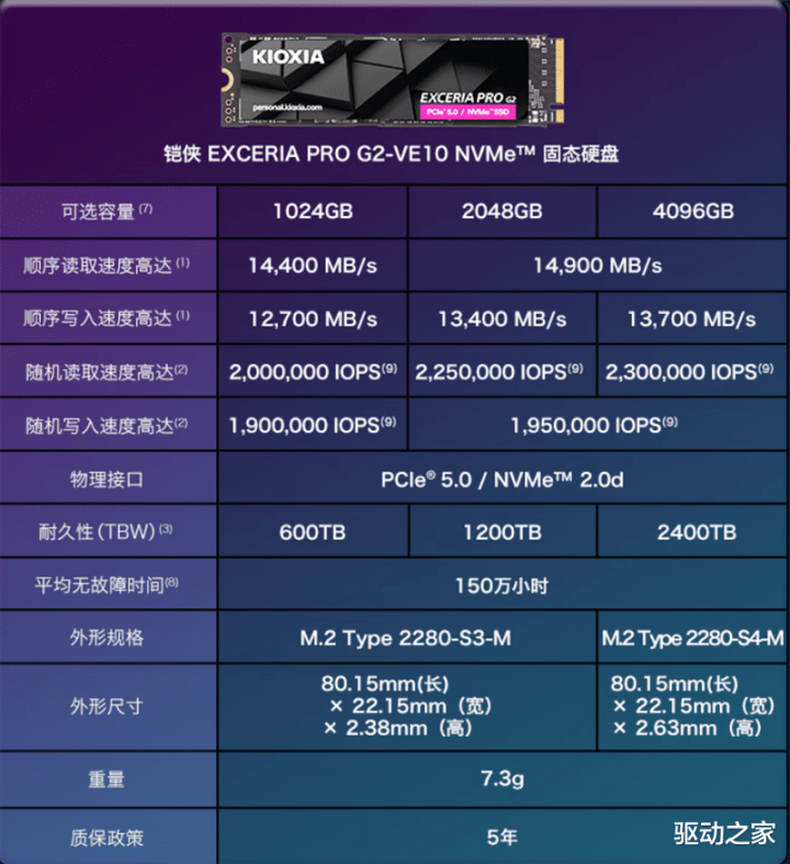 永远性方面,EXCERIA PRO G2有3个容量版块 ,1TB版最大写入量为600TBW,2TB版为1200TBW,4TB版为2400TBW,另外还有质保五年。