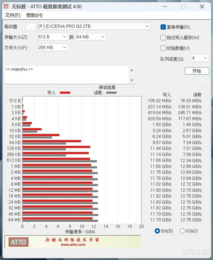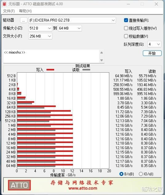 ATTO Disk Benchmarks后果来看,关于0.5KB的小文献读写,EXCERIA PRO G2 2TB能达到105MB/s的写入速率和76MB的读取速率。