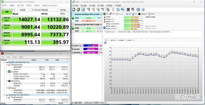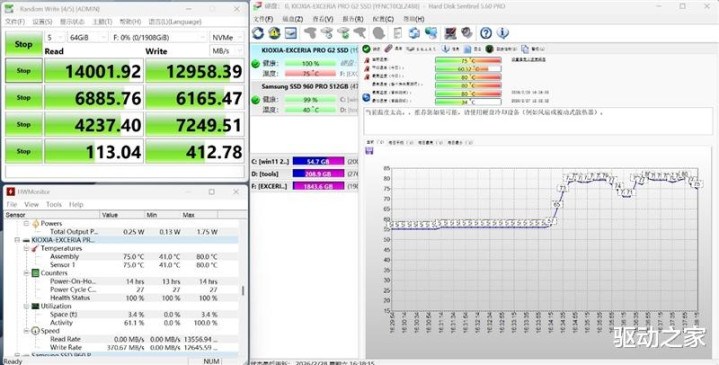使用CrystalDiskMark 64GB来测试铠侠EXCERIA PRO G2 2TB SSD在高负载读写下的温度进展,测试平台为i9-14900KS平台,测试时室温26度。