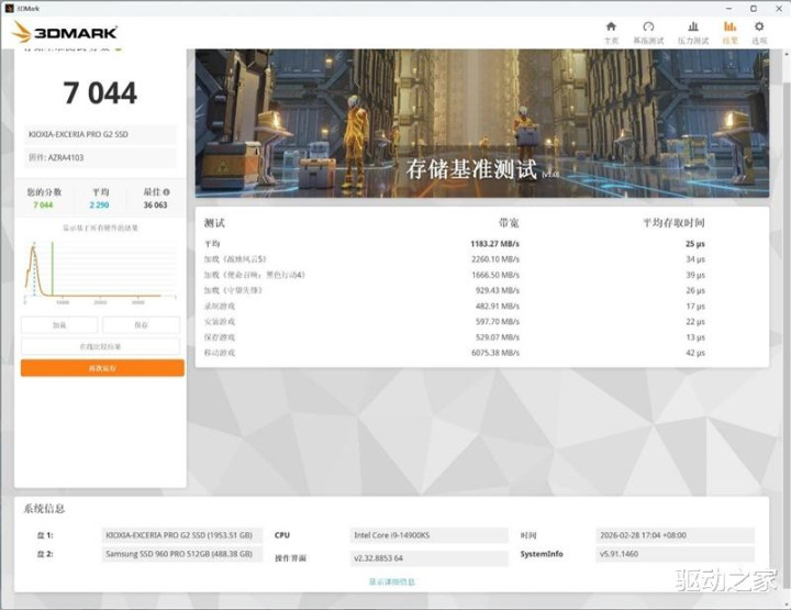 在搭配i9-14900KS处分器进行测试时,铠侠EXCERIA PRO G2 2TB SSD跑出了144MB/s的4K立地读取速率、3DMark存储基准测试分数则是恐怖的7044分,PCMark 10快速系统盘基准测试收获为8747分,蔓延更是低至14微秒。