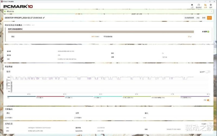 PCMark 10快速系统盘基准测试得分4609分,带宽547MB/s、平均存取时分27微秒。