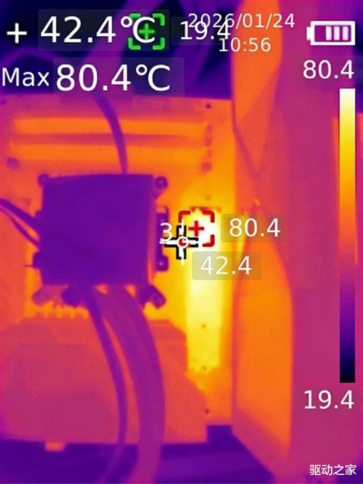 从热成像图来看,SSD高温区域在主控那一块,最高温度是80.4度。