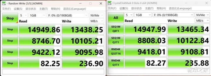 AMD平台的立地性能比Intel平台要弱一些,但顺序读取速率更高,顺序读取14949MB/s、写入13438MB/s。