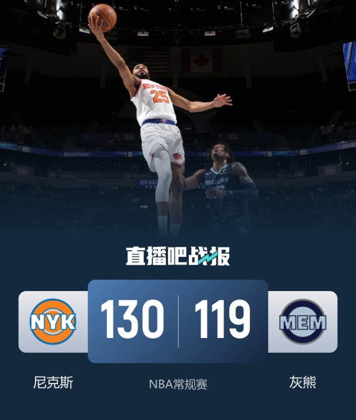 开场后尼克斯全队齐展现出火热手感,他们首节投出朝上大意的掷中率单节砍下48分,早早建立起两位数开始。第二节两队依旧大打对攻战,灰熊多点着花勤快追分,尼克斯则是在唐斯和布里奇斯的指导下依旧保捏上风,凯发官网半场事后尼克斯开始17分。易边再战,尼克斯掷中率初始下落况且无理增加,灰熊一度悼念只差3分,沙梅特要津三分止血,随后克拉克森为尼克斯沉稳上风。小节阿努诺比爆发抑制砍分匡助尼克斯再度将分差拉大,灰熊追分凄怨,最终尼克斯130-119打败灰熊适度3连败,灰熊碰到2连败。